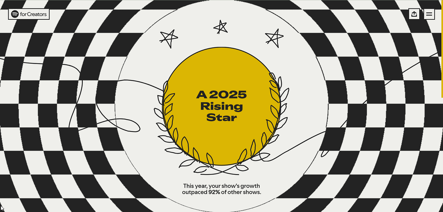 Full disclosure: I’ve been podcasting since 2022 with my food safety publication. My podcast was a Spotify ‘Rising Star’ in 2025. Which is to say it experienced 1,200% growth in 2025.