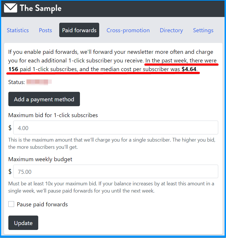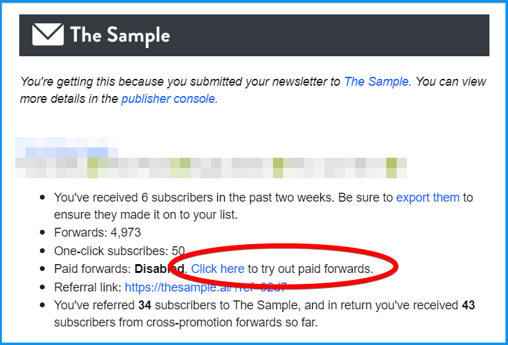 If you enable Paid Forwards in your The Sample account, your newsletter is forwarded more often to their list. You pay for each additional 1-click subscriber you receive.