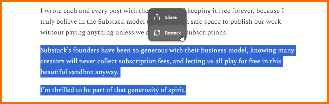 Restack by clicking the circular arrows icon at the bottom of a post or by highlighting a small section of text and clicking the restack icon in the box that appears.